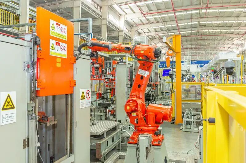 位于佛高区三水园的佛山海尔滚筒互联工厂5G无人化内筒线上,自动化智能j机器人正在搬运洗衣机内筒。/佛山日报记者王澍摄