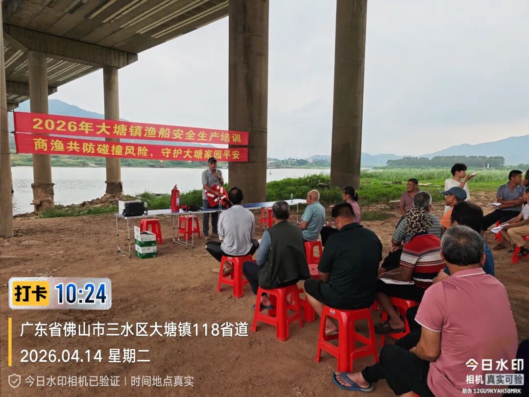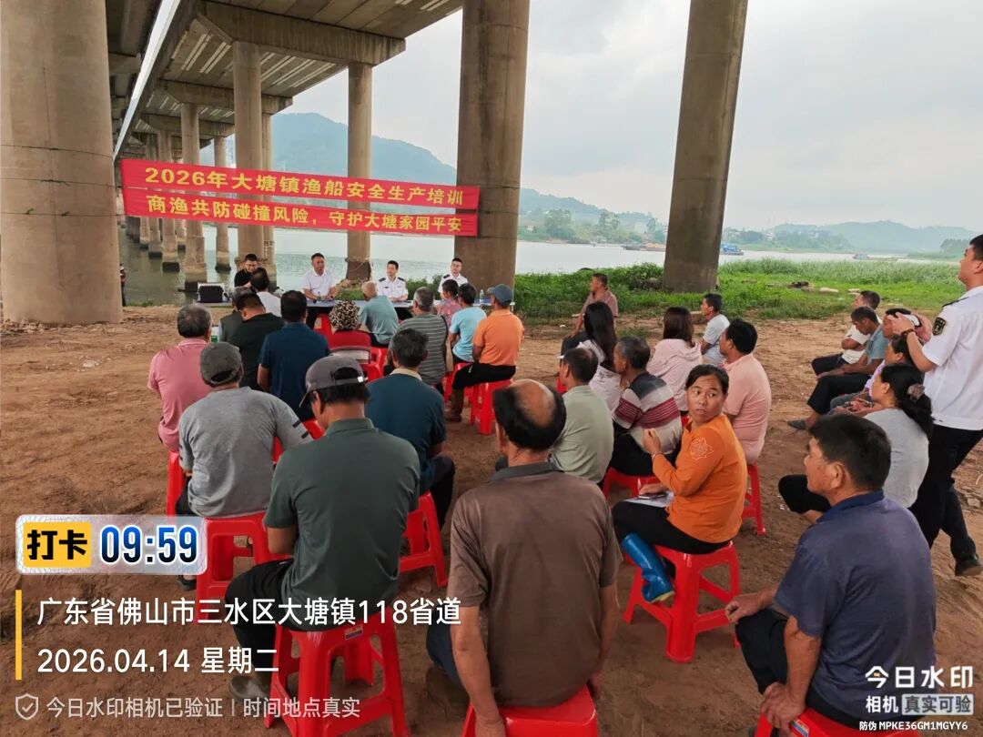 为进一步做好我镇水上交通与渔业船舶安全生产工作,4月14日,大塘镇联合三水区农业农村局、三水海事处在大塘镇油金桥底举办2026年大塘镇渔船安全生产现场培训会,约50名渔民代表参加了本次培训。三水区农业农村局和三水海事处代表出席培训会。