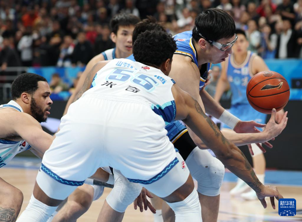 4月14日,北京北汽队球员周琦(右一)在比赛中拼抢。