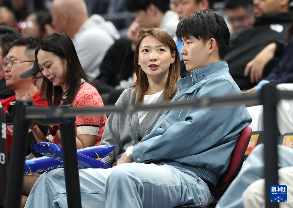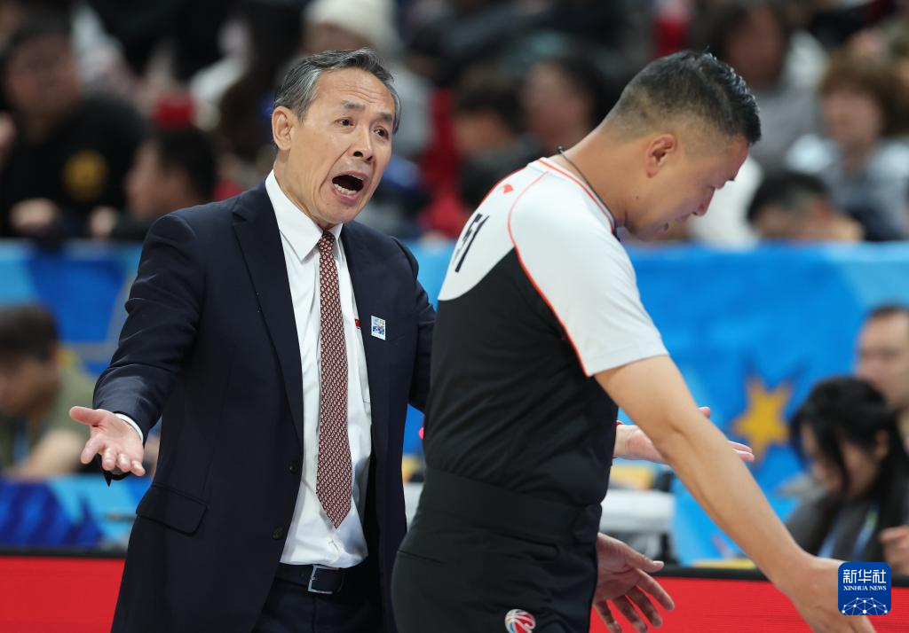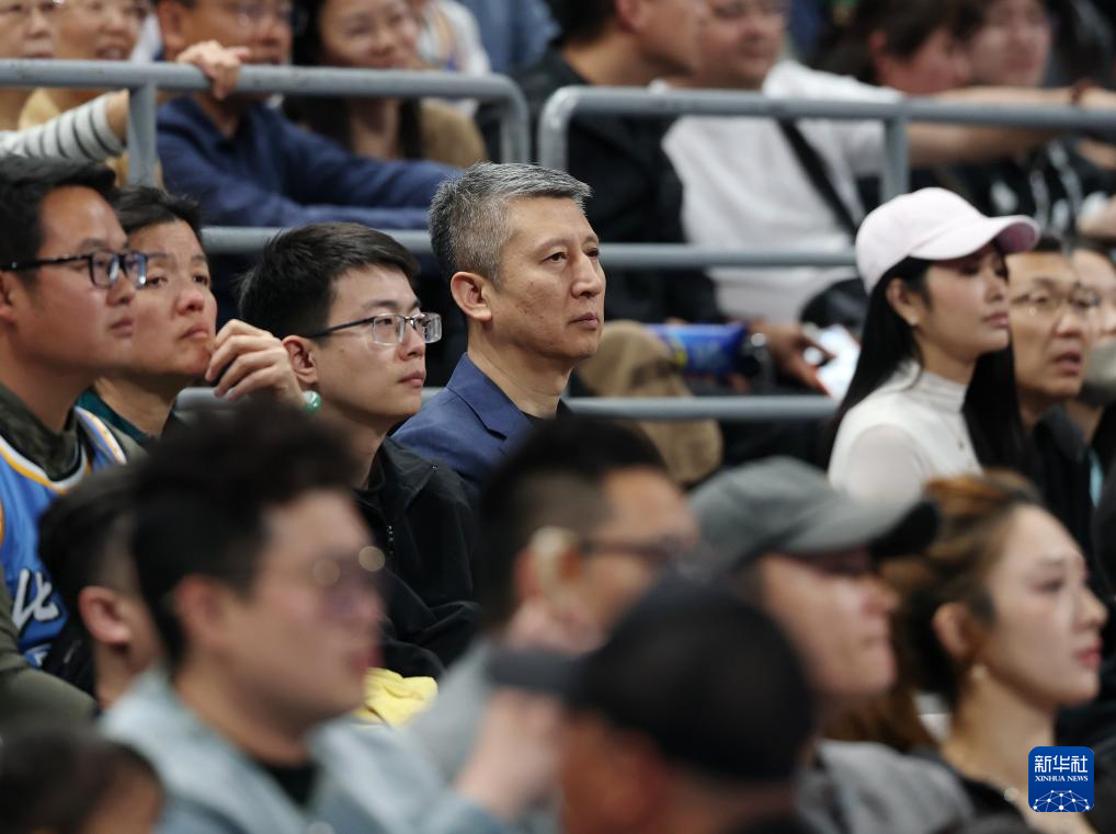 4月14日,中国国家男子篮球队主教练郭士强(中)在看台观赛。