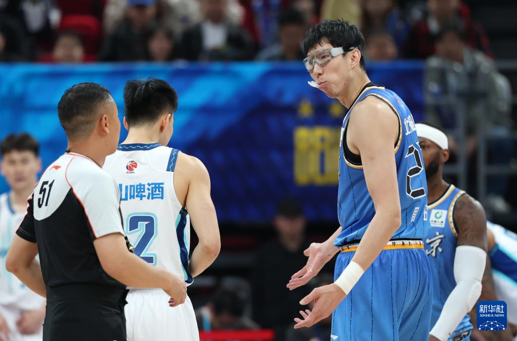 4月14日,北京北汽队球员周琦(右)在比赛中与裁判交流。