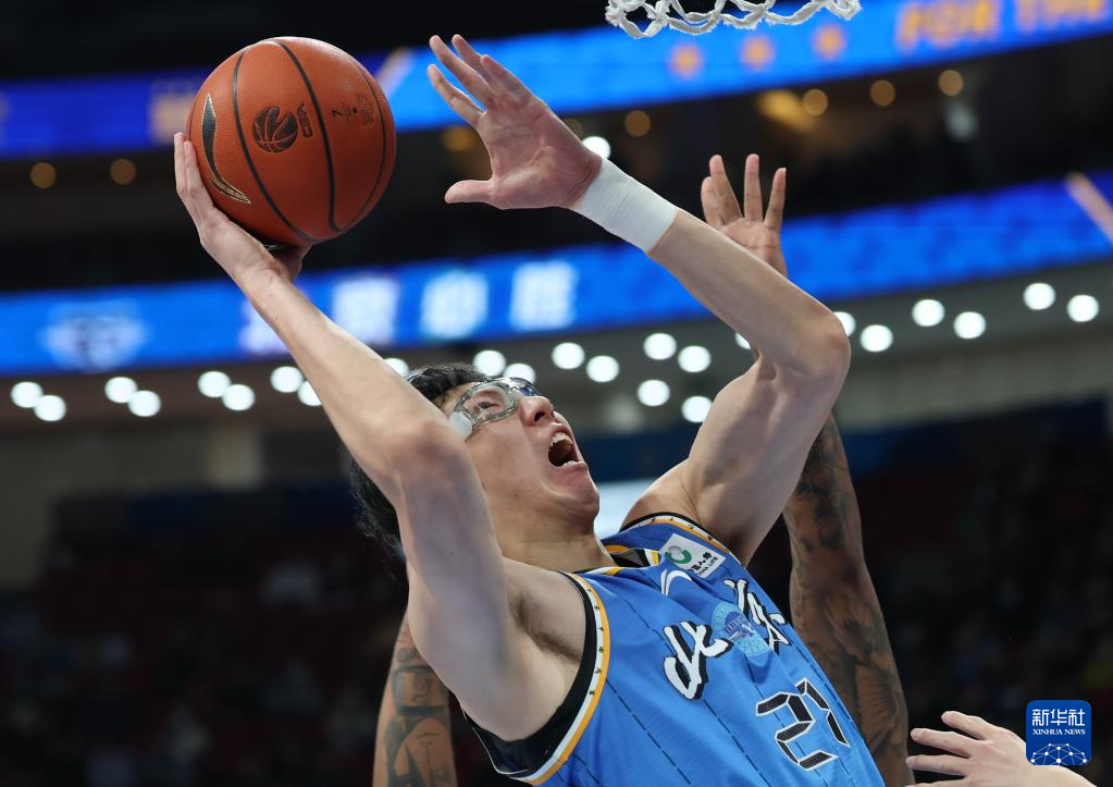 4月14日,北京北汽队球员周琦在比赛中上篮。