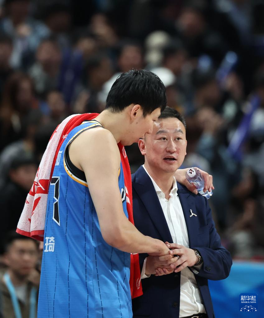 4月14日,青岛崂山啤酒队主教练刘维伟(右)赛后与北京北汽队球员周琦交谈。