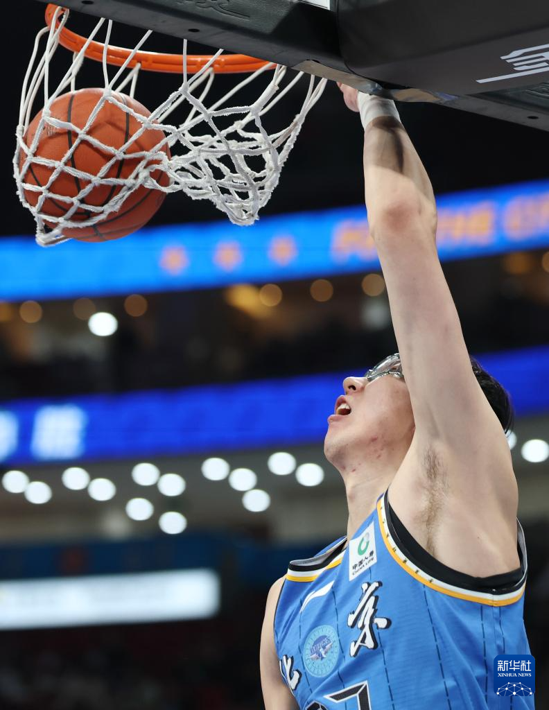 4月14日,北京北汽队球员周琦在比赛中扣篮。