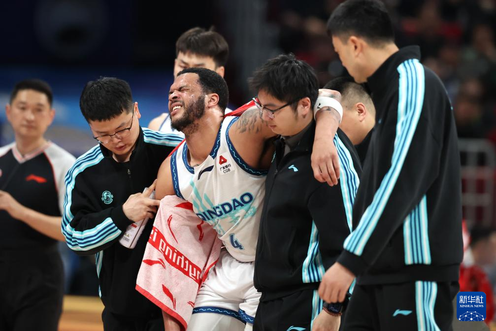4月14日,青岛崂山啤酒队球员韦瑟斯庞(中)在比赛中受伤后被搀扶下场。