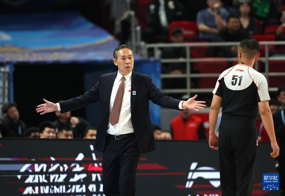 4月14日,北京北汽队主教练许利民(左)对裁判判罚表示不满。
