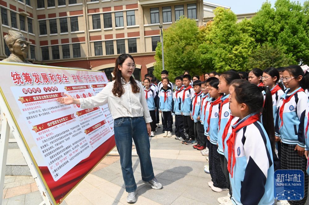 4月14日,在河南省沁阳市朱载堉学校,老师为小学生讲解国家安全知识。新华社发(杨帆摄)