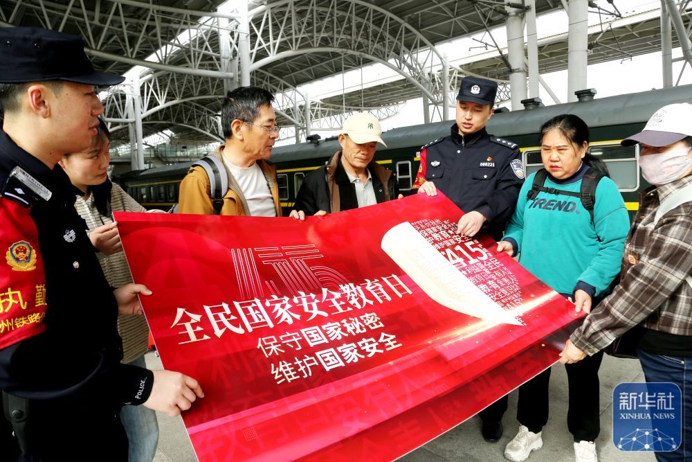 4月14日,江苏徐州铁路公安处连云港东站派出所民警为旅客讲解国家安全知识。新华社发(王春摄)