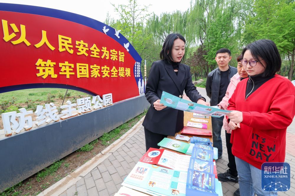4月14日,在河北省石家庄市新华区石太公园,普法工作人员(左一)为群众讲解国家安全相关知识。新华社发(梁子栋摄)
