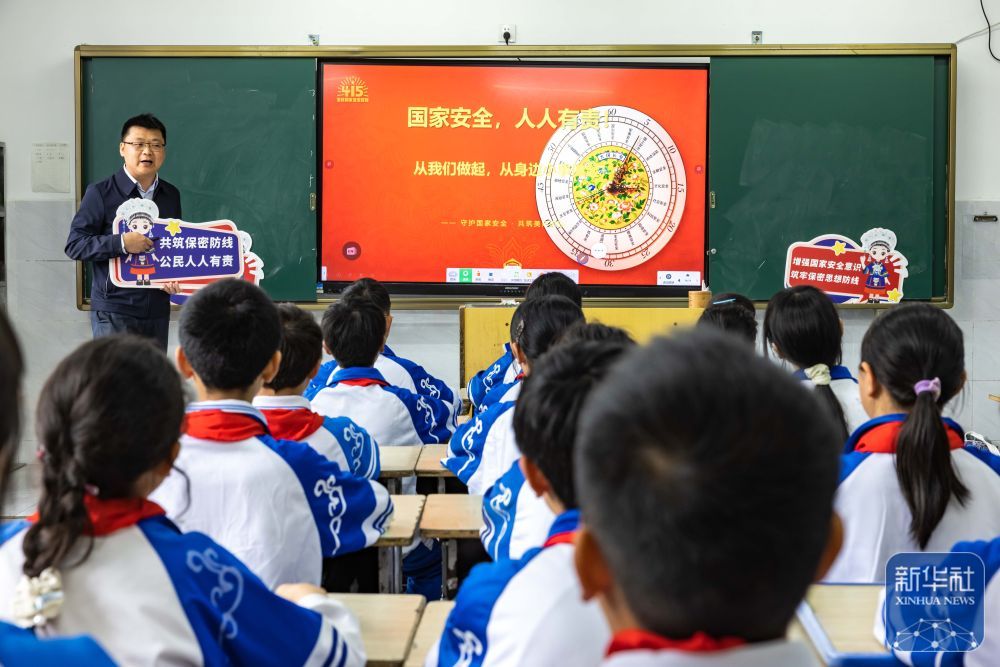 4月14日,贵州省安顺市国家保密局宣讲员在安顺市第七小学为学生讲解国家安全知识。新华社发(陈熙摄)