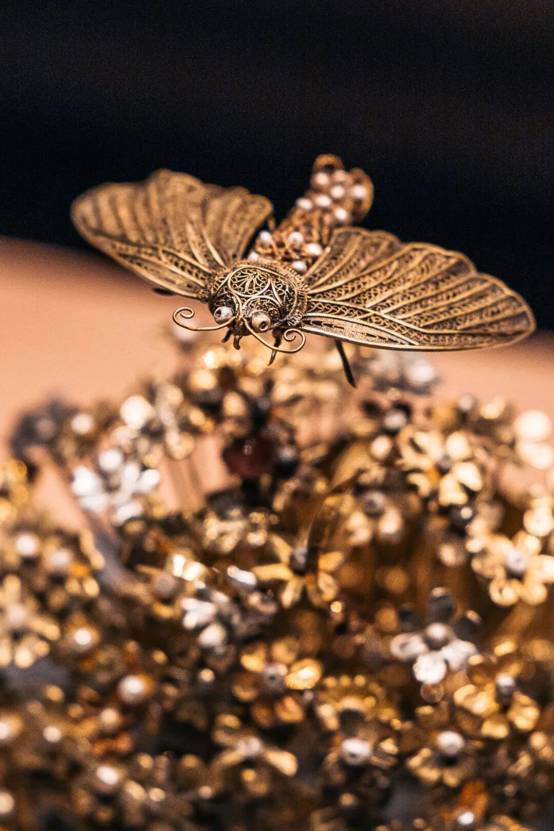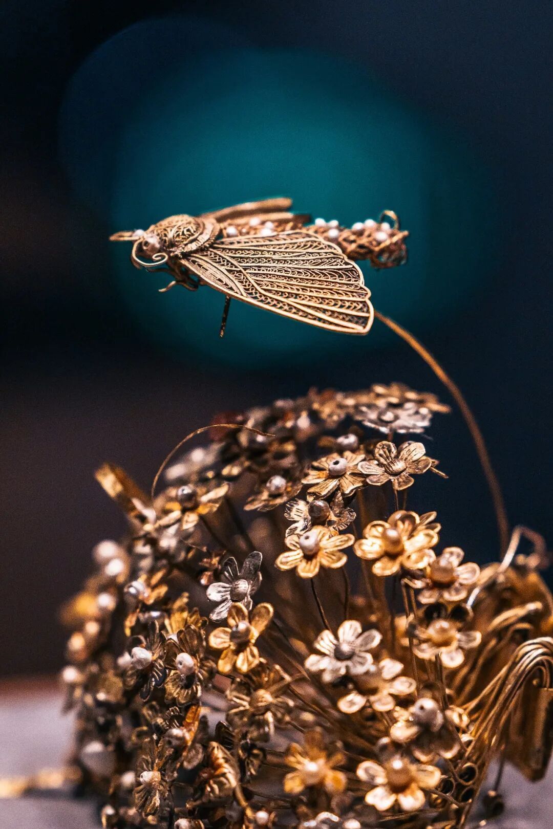 闹蛾金钗出土后状态欠佳,很长时间存放在库房中。为了这次展览,中国国家博物馆团队对它进行了长达数月的修复。修复时,修复团队轻柔小心地去除金钗表面土壤附着物、老化黏结剂与不稳定腐蚀产物,还原文物本身形貌。