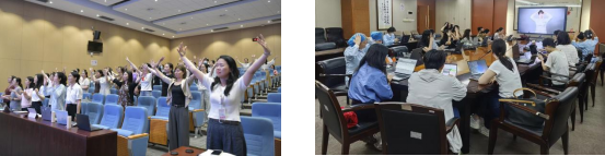 本次工作坊突破传统“单向授课”模式,采用“人机互动、现场实操”的沉浸式教学形式,围绕“AI赋能课程开发”全流程展开。活动邀请院级小讲课组长陈虹羽担任主讲老师,多位助教老师现场巡回辅导,手把手指导操作,确保每位学员都能跟上节奏、学以致用。工作坊还特别设置了AI数字人互动环节,在陈虹羽引导下,学员与AI数字人默契配合,一同完成手指舞《和你一样》。该环节现场氛围活跃,生动展现AI在护理教学中情感交互、趣味教学等方面的应用,赢得现场阵阵掌声。
