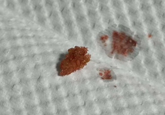 检查结束,我低头整理器械,突然发现垫巾上躺着一颗芝麻大小的灰褐色石头。