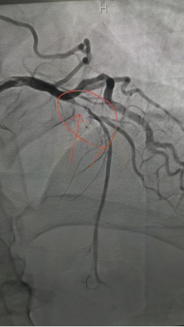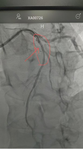 造影显示该患者为近端次全闭塞——几乎堵死了。手术团队精准操作,植入1枚药物球囊后,该患者症状立即缓解。