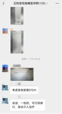接诊的医生迅速响应,初步判断后,立即行心电图检查,同步启动胸痛患者应急处置流程。医生将心电图反馈到胸痛联系群,会诊结果很快传回:急性前壁心肌梗死——通俗说,就是心脏最重要的一根血管堵了,随时有生命危险。