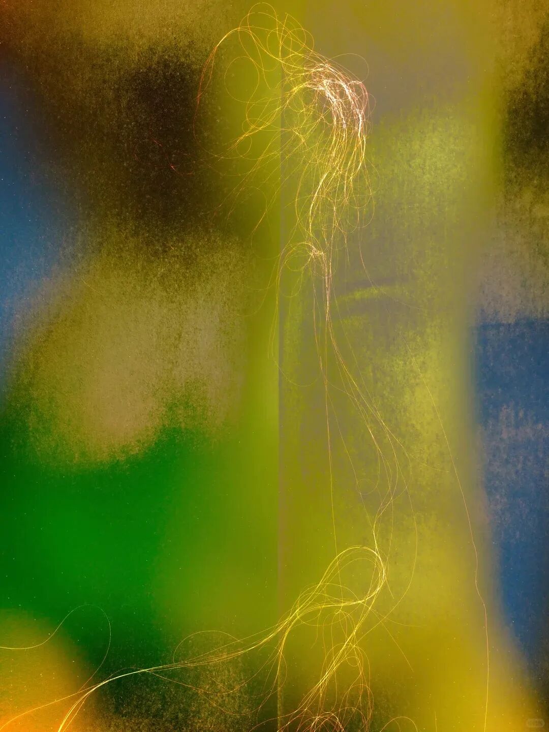 在空间中,这组作品以“子母”的方式展开—两张摄影作品相对而立,被一段具体而脆弱的综合材料所连接。这段连接像是一种尚未被命名的“关系组织”:它拉扯、延展、维系,同时也在时间中逐渐显露出其不稳定性。 自我的形象在记忆中消融,不再以清晰的轮廓存在,而是以一种弥散的状态,渗入到情绪、触感与时间的颗粒之中。