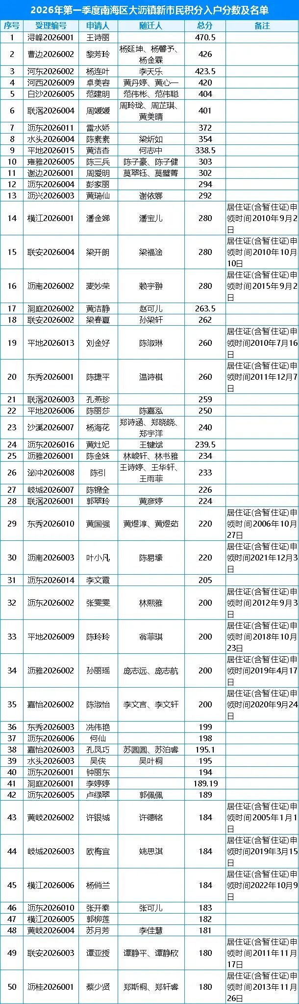 2026年第一季度南海区大沥镇新市民积分入户积分汇总工作已完成,根据《佛山市新市民积分制服务管理办法》(佛府办〔2023〕20号)和《关于南海区2026年度各镇街按季度分配积分入户指标数的通知》规定,本着公平、公正、公开的原则,现将2026年第一季度南海区大沥镇新市民积分入户分数及名单予以公示,市民可关注“南海大沥”微信公众号或登录“佛山市南海区人民政府网”中查询。
