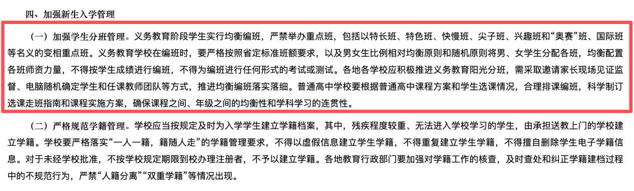 同年2月,广东省教育厅发布《关于进一步规范普通中小学招生入学工作的指导意见》(以下简称《意见》),提出义务教育阶段学生实行均衡编班,严禁举办重点班,包括以特长班、特色班、快慢班、尖子班、兴趣班和“奥赛”班、国际班等名义的变相重点班。
