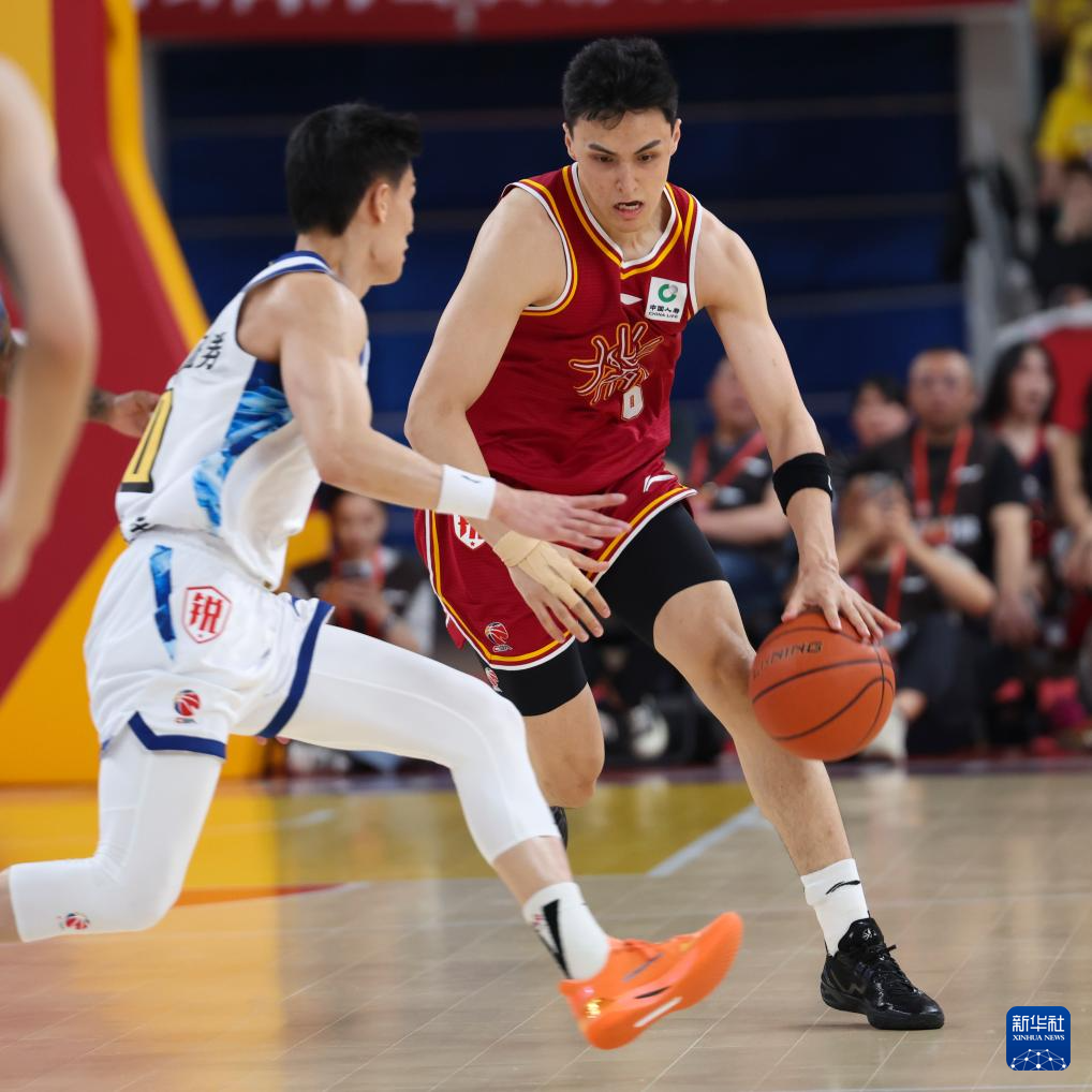 4月15日,山西汾酒队球员于米提(右)在比赛中运球突破。