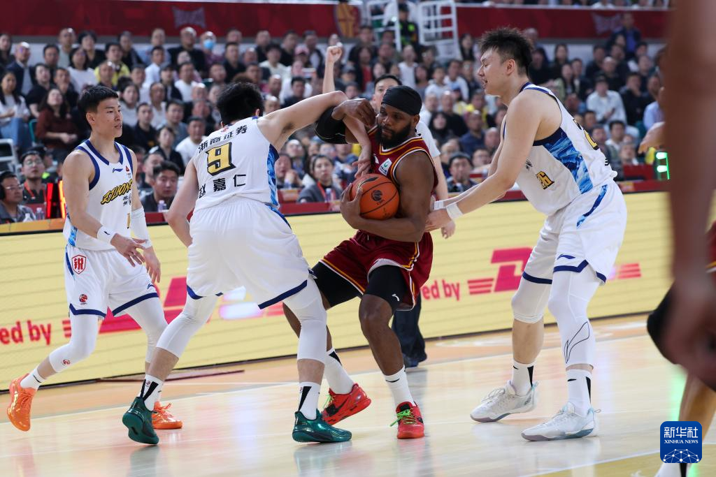 4月15日,浙江浙商证券队球员卡尔顿(中)在比赛中进攻时遭到犯规。