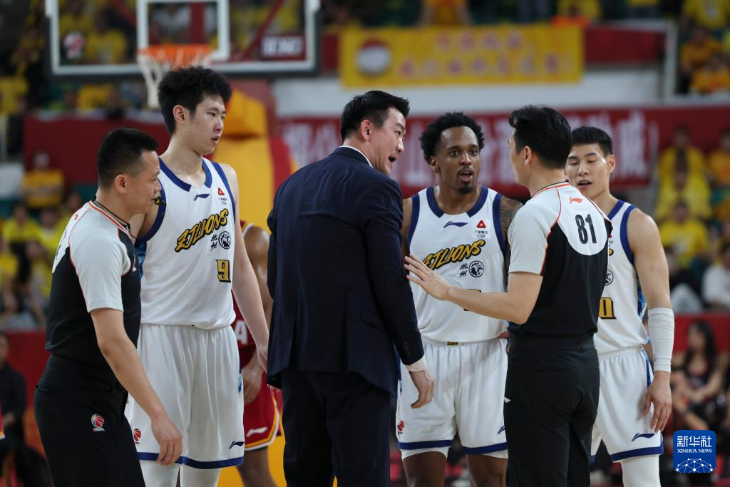 4月15日,浙江浙商证券队主教练王博(左三)在比赛中对判罚结果提出异议。