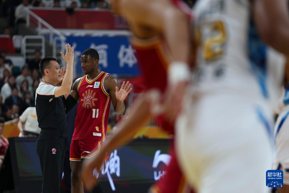 4月15日,山西汾酒队球员迪亚洛(左二)在比赛间隙与裁判交流。