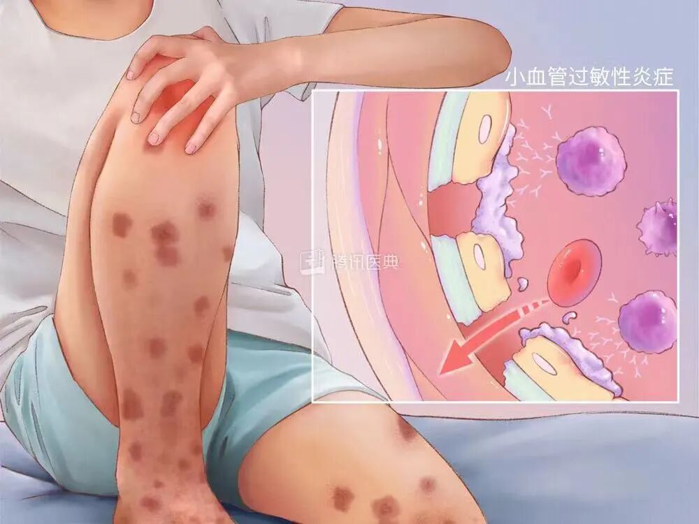 皮肤病:比如过敏性紫癜,它是免疫应答异常引起的血管炎症,会引起皮疹表现,如红点、瘀斑,按压不褪色,主要在下肢,尤其是小腿和踝关节附近。