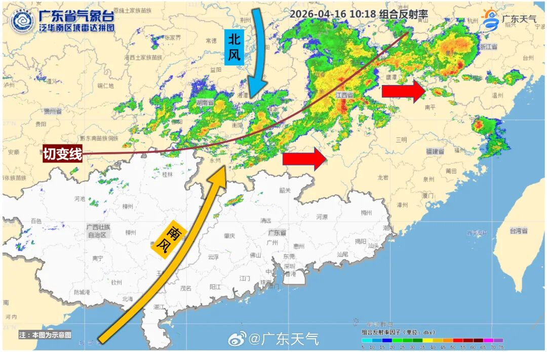 今天(4月16日)上午,冷暖气流在江南一带交汇,产生线状对流云团并随着高空波动逐渐东移,韶关、清远也有分散雷雨云团出没。
