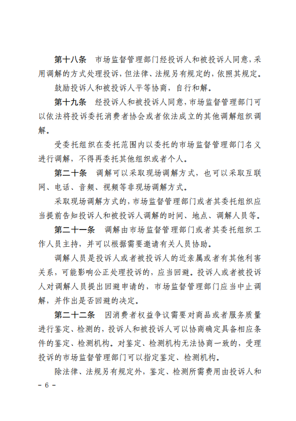强化权益保护,推动纠纷化解。完善行政调解程序,对投诉不予受理的告知、鉴定检测程序、委托调解、调解期限、调解的救济等作了增补修改;新增投诉处理的回访问效要求;新增规定开展消费预警和风险提示,引导经营者通过消费维权服务站、首问负责、先行赔付、在线争议解决等机制预防和解决消费者权益争议,推动消费环境源头治理。