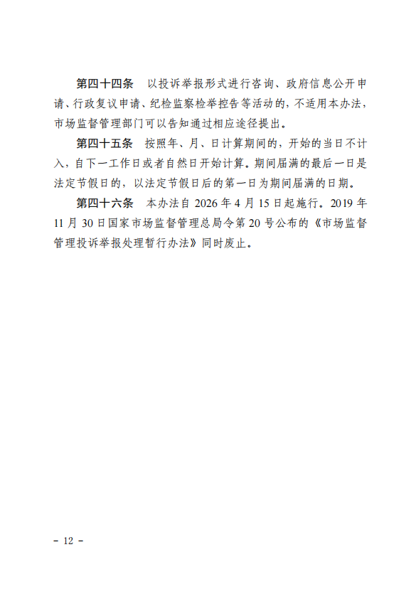 《办法》自2026年4月15日起施行,原《市场监督管理投诉举报处理暂行办法》同时废止。