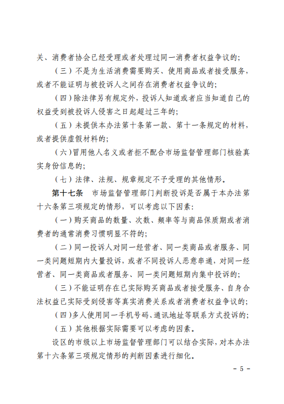规制恶意索赔,防止制度滥用。新增规定不得滥用投诉举报权利,牟取不正当利益,侵害经营者的合法权益;明确投诉人应当提供真实身份信息和相应的事实依据,对提供虚假材料、冒用他人名义、拒不配合核验真实身份的不予受理;在立法层面列举判断生活消费需要的考虑因素;明确对敲诈勒索、骗取赔偿等违法索赔的终止调解,并移送公安机关依法处理。