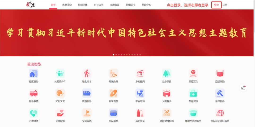 ①使用电脑登录i志愿官网:https://www.gdzyz.cn/,点击“登录”,选择“志愿者登录”。