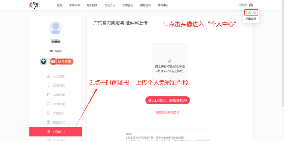 ②点击头像进入“个人中心”,找到左侧“时间证书”栏目并点击,上传个人免冠证件照。