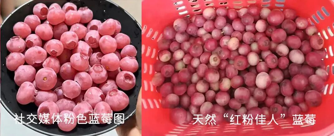 天然成熟的“红粉佳人”蓝莓,果实颜色并非通体粉色,而是粉中带紫,果柄部位多为白色或青色,并不会出现全粉、全红的状态。若图片中粉色蓝莓颜色过于艳丽、通体粉红,大概率是经过后期修图处理,并非果实本身的真实色泽。