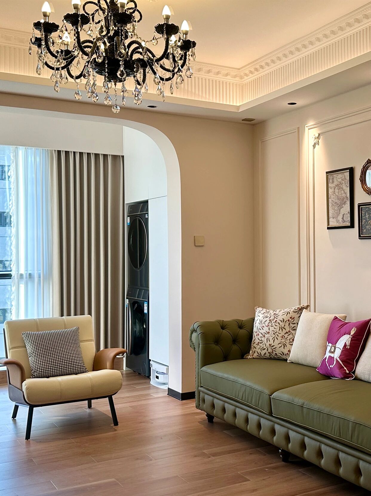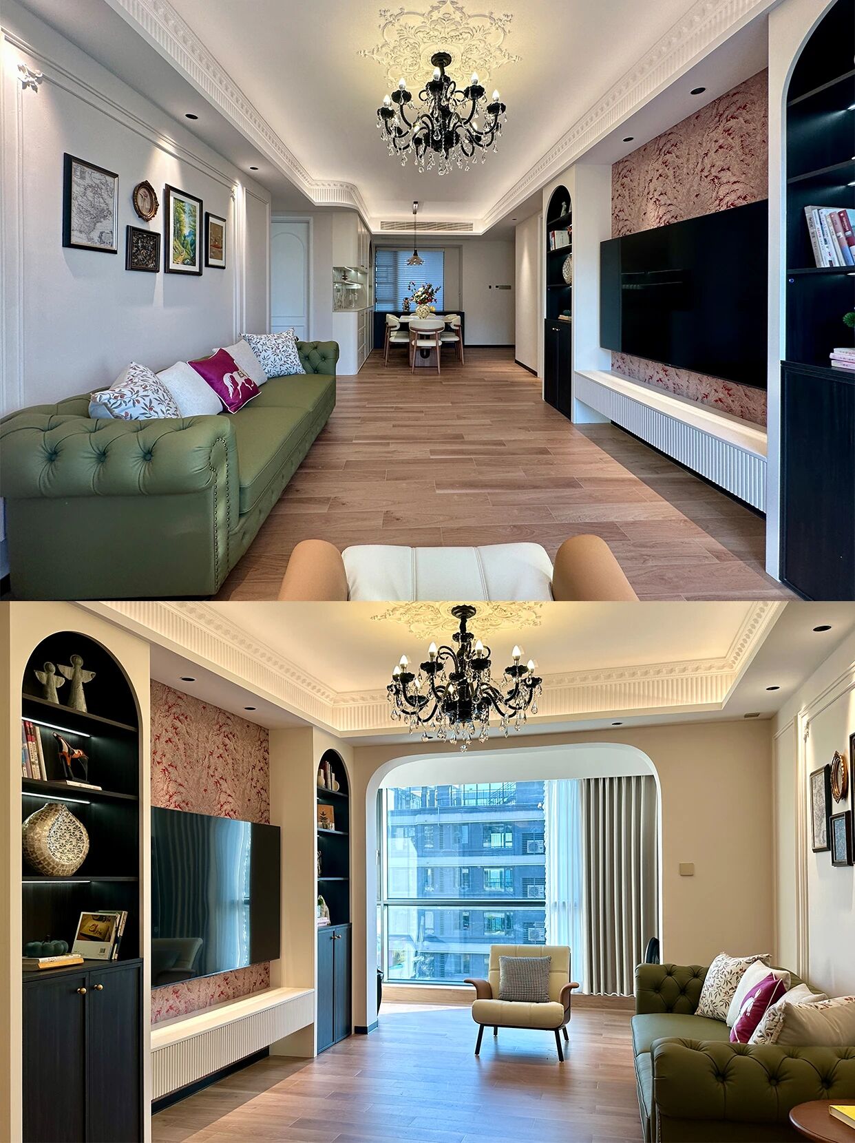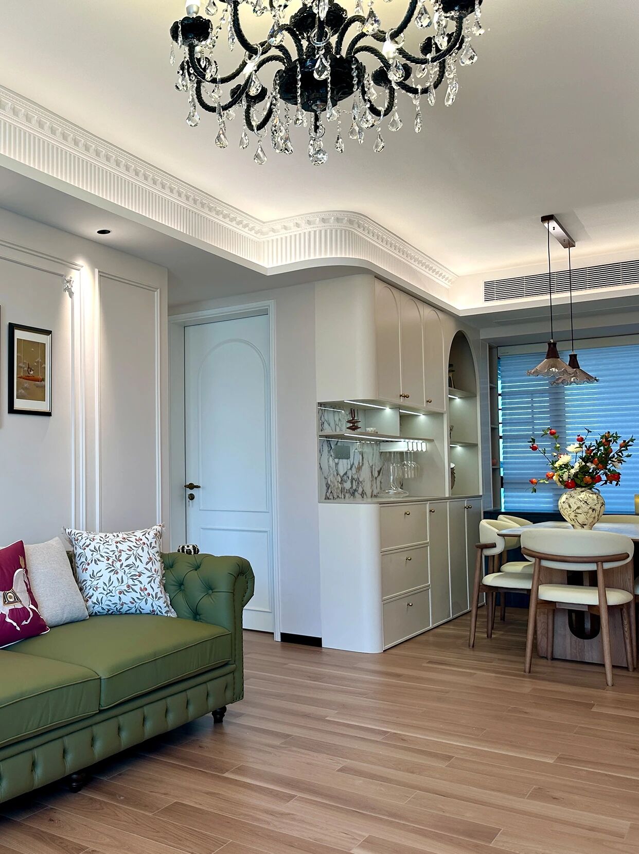 墨绿雕花皮质沙发+奶油色单椅,搭配水晶吊灯与复古挂画,弧形拱门与直线柜体的碰撞,柔润线条中和了硬朗,慵懒的法式浪漫里,藏着恰到好处的精致格调~