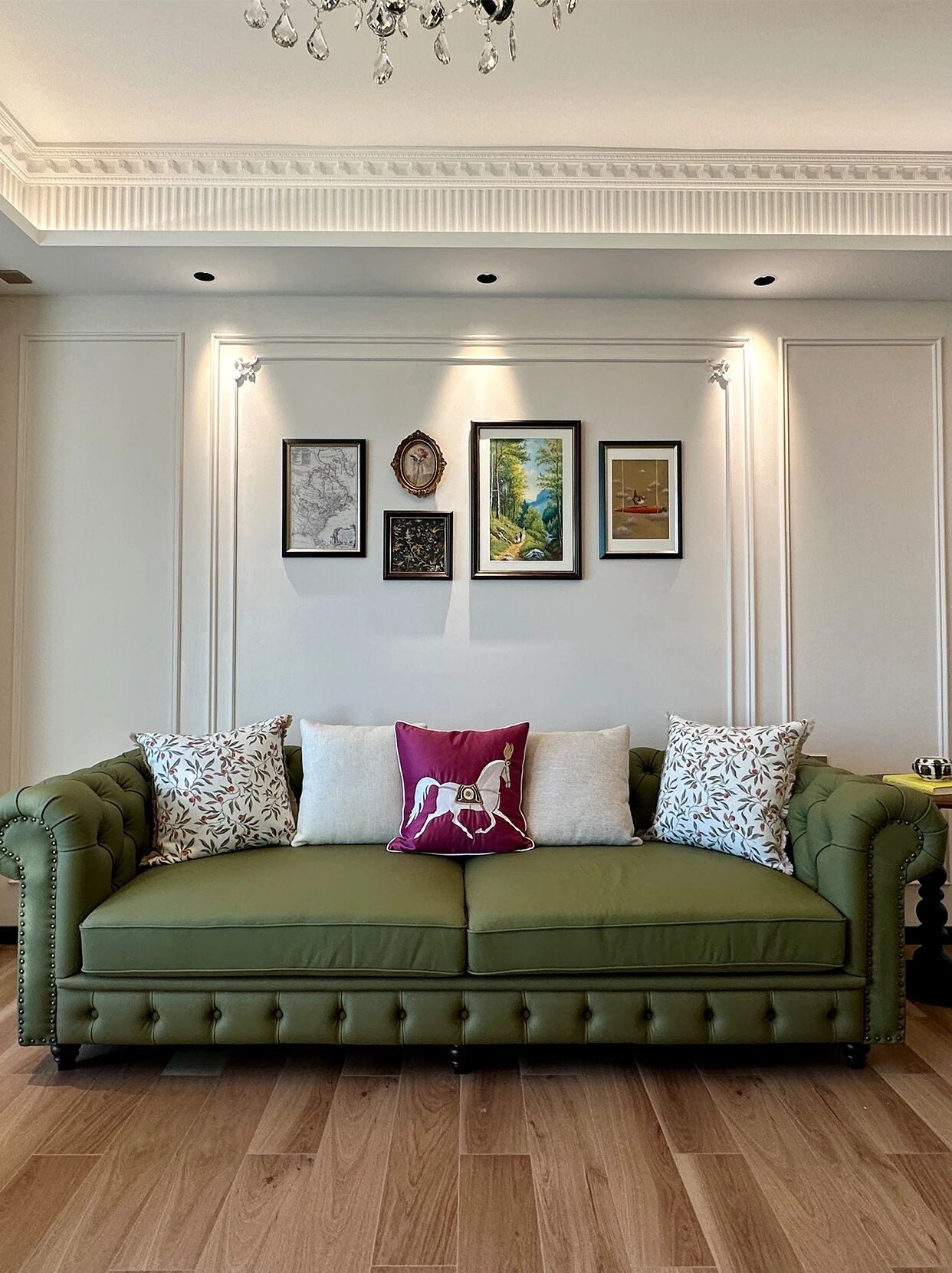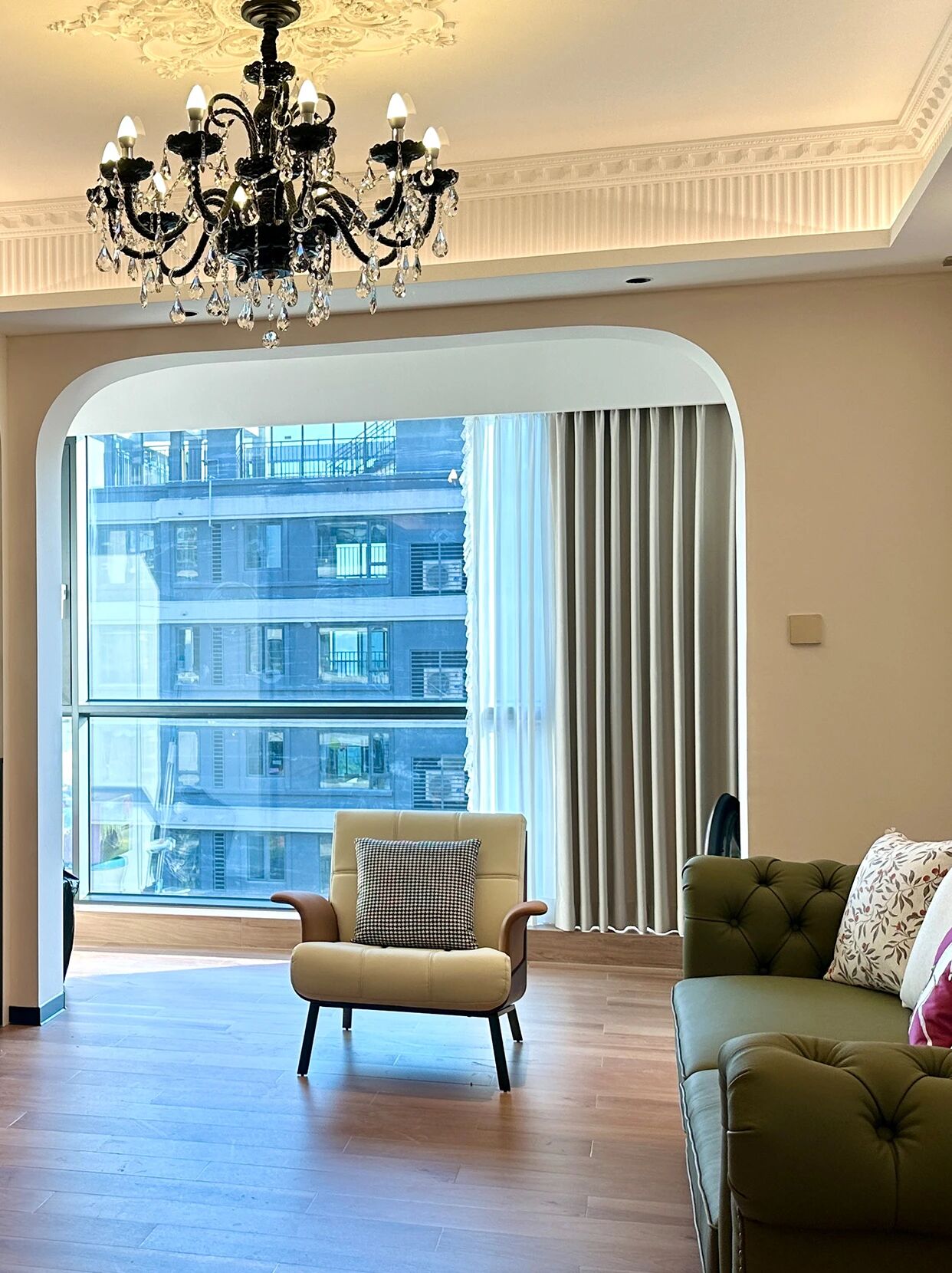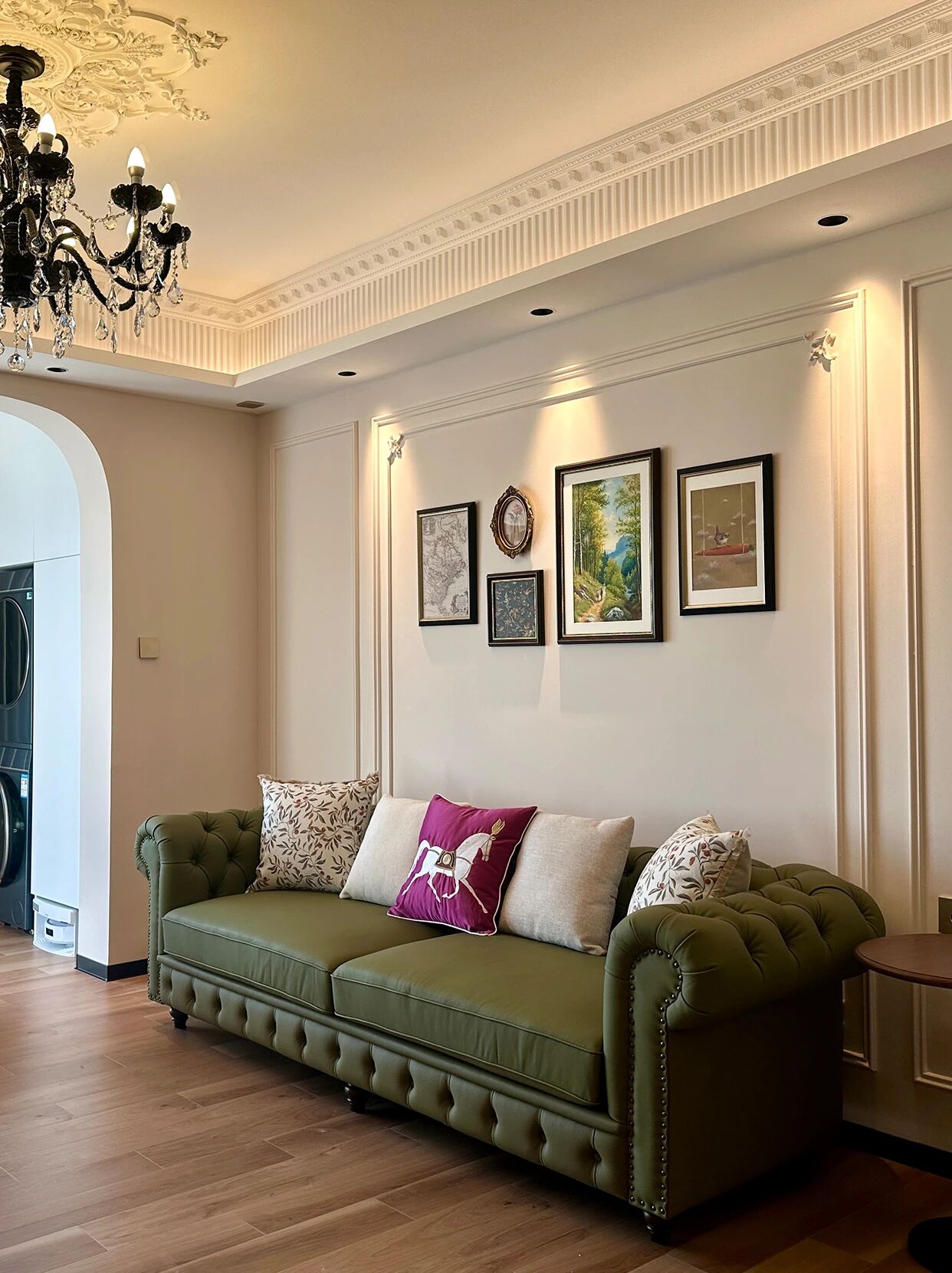 墨绿雕花皮质沙发+奶油色单椅,搭配水晶吊灯与复古挂画,弧形拱门与直线柜体的碰撞,柔润线条中和了硬朗,慵懒的法式浪漫里,藏着恰到好处的精致格调~