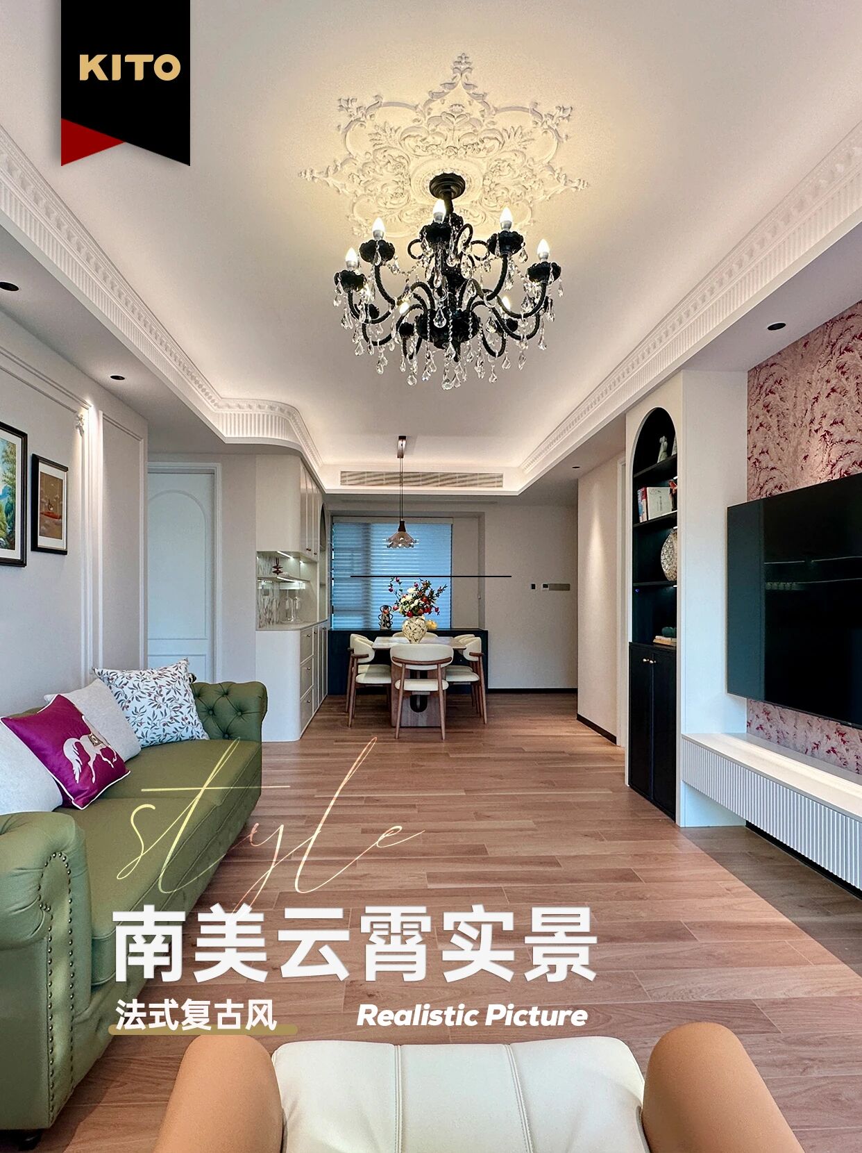 ✔️ 10%墨绿/雅黑:墨绿皮质沙发、雅黑金属吊灯点缀,冷调撞色让空间层次瞬间立体,复古韵味也跟着翻番~