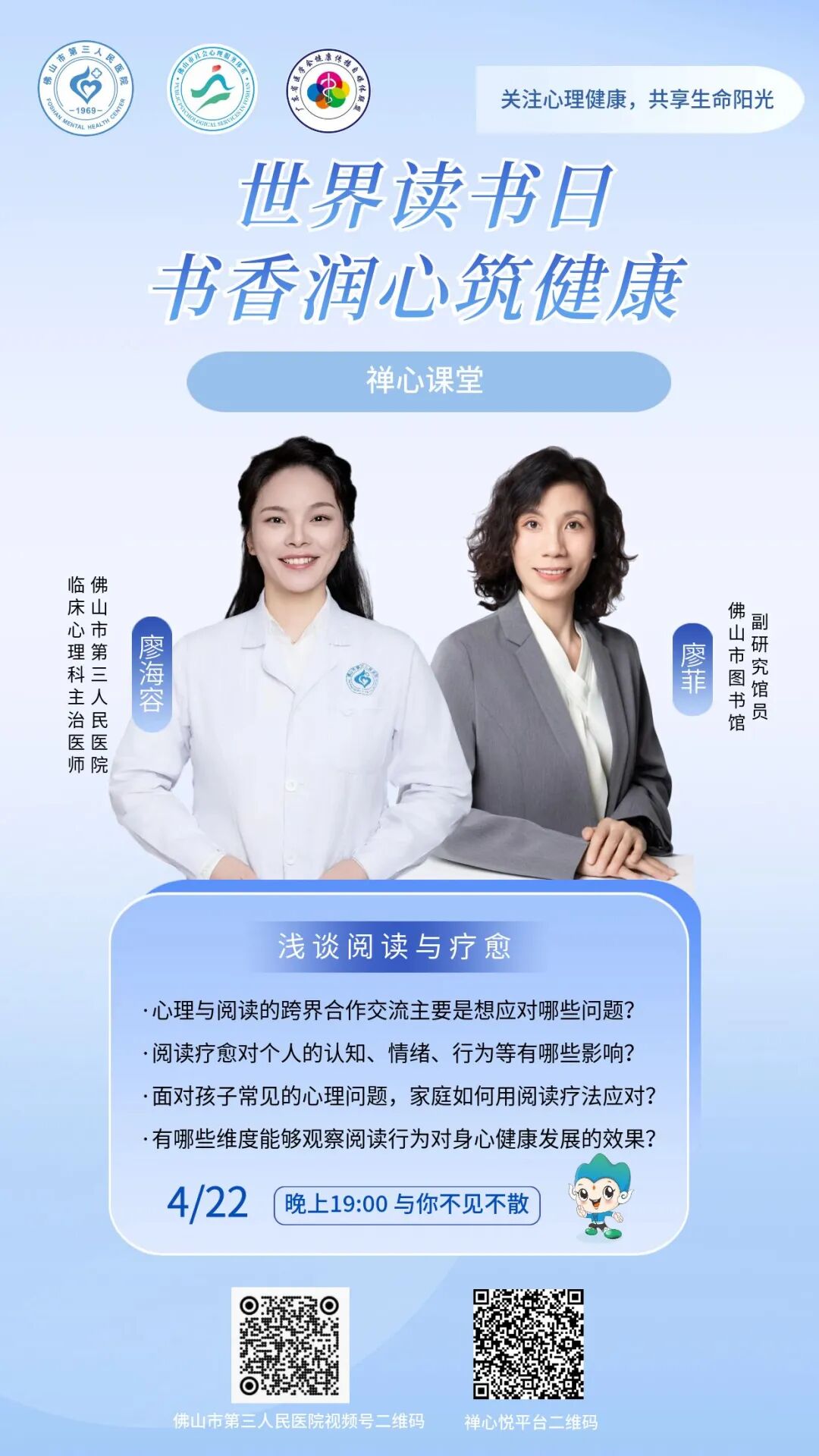 为了让大众认识阅读疗愈,提升心理健康素养水平,本期禅心课堂的专题直播——《书香润心筑健康》将于4月22日晚上19点播出。届时,我院临床心理科廖海容医生将联合佛山市图书馆副研究馆员廖菲老师,从各类群体的常见心理健康问题,结合阅读疗愈的应用,共同探讨阅读在心理健康领域的独特作用。同时,专家们还会推荐相关的书目清单,帮助大家找到适合自己的阅读疗愈路径。