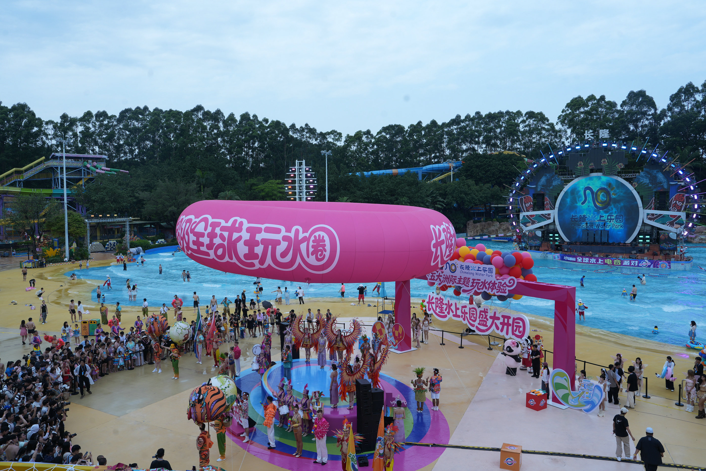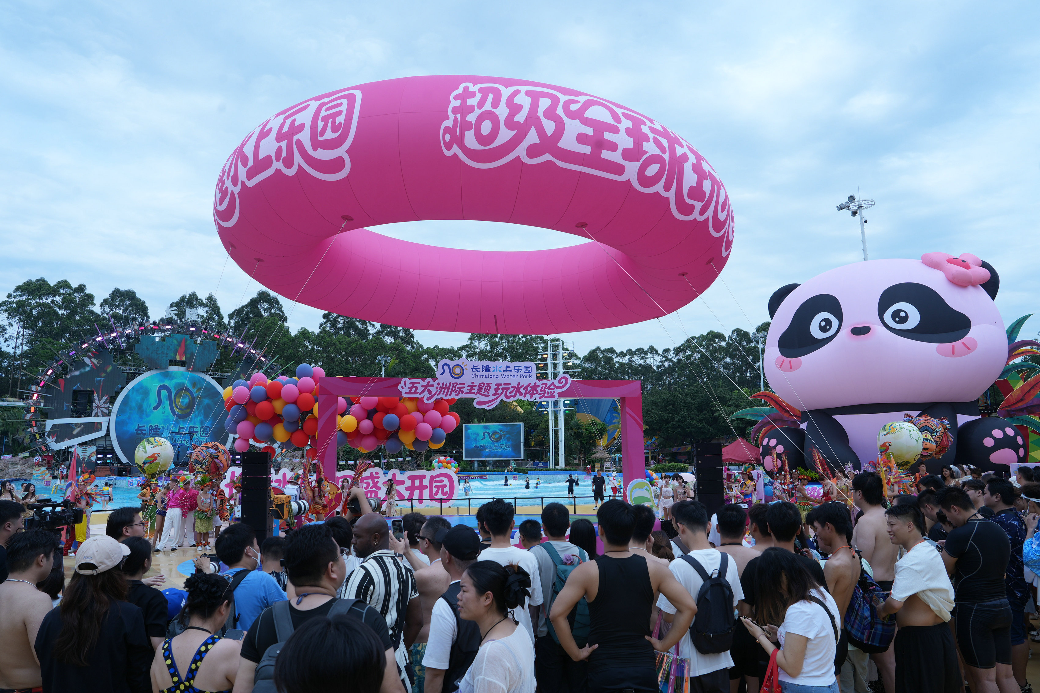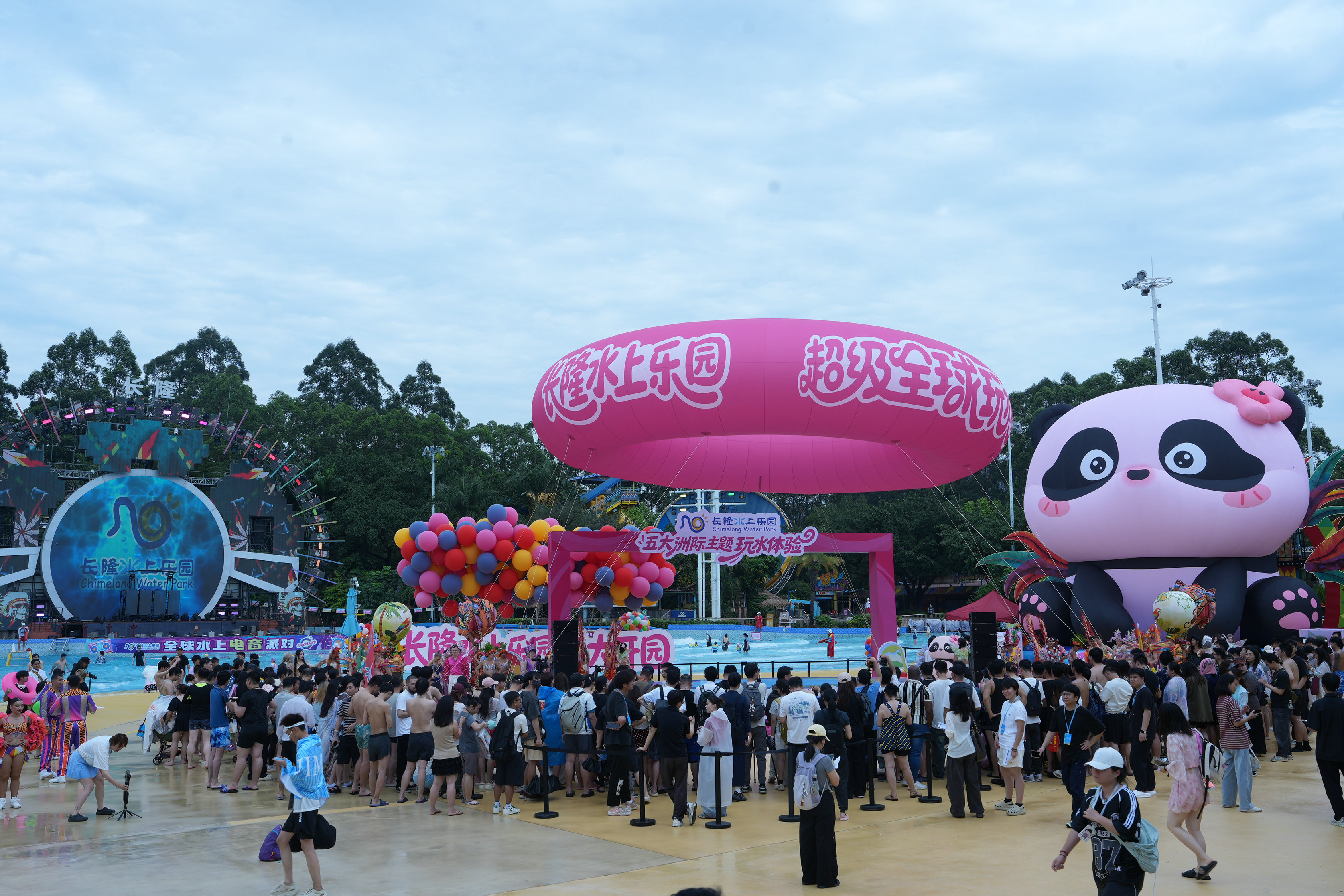 4月17日,广州长隆水上乐园正式开园,以“超级全球玩水圈”拉开2026年夏日玩水序幕。今年园区打造五大洲际主题玩水体验,游客无需远行便能沉浸式解锁环球玩水狂欢。同日,长隆原创IP“大熊猫妹猪”也同步亮相,吸引大批游客拍照打卡。