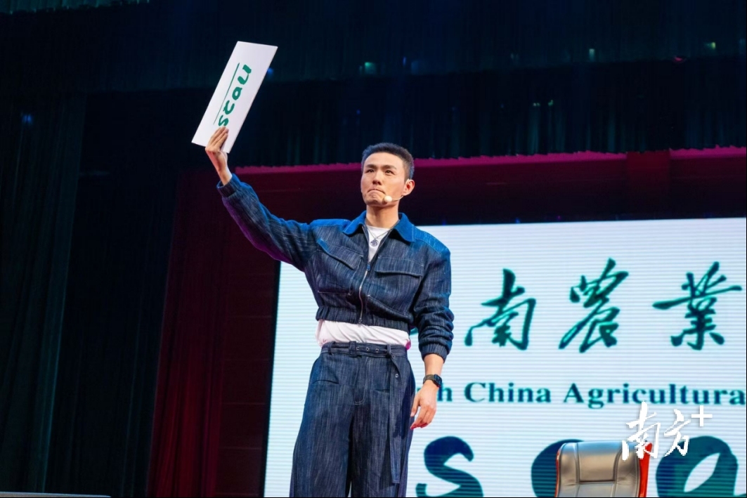 值得一提的是,数字预言的答案是华南农业大学的英文缩写“SCAU”,引起在场师生的共鸣,爆发热烈掌声。在与主持人的对谈中,邓男子分享了自己从热爱魔术到成为职业魔术师、从央视春晚舞台到校园舞台的创作经历。他坦言,魔术不仅是“手的艺术”,更是“心的艺术”,希望将“相信美好、热爱生活”的信念传递给更多年轻人。活动现场,华南农业大学副校长钟强为邓男子颁发了“华南农业大学艺术素质中心特约导师”证书。