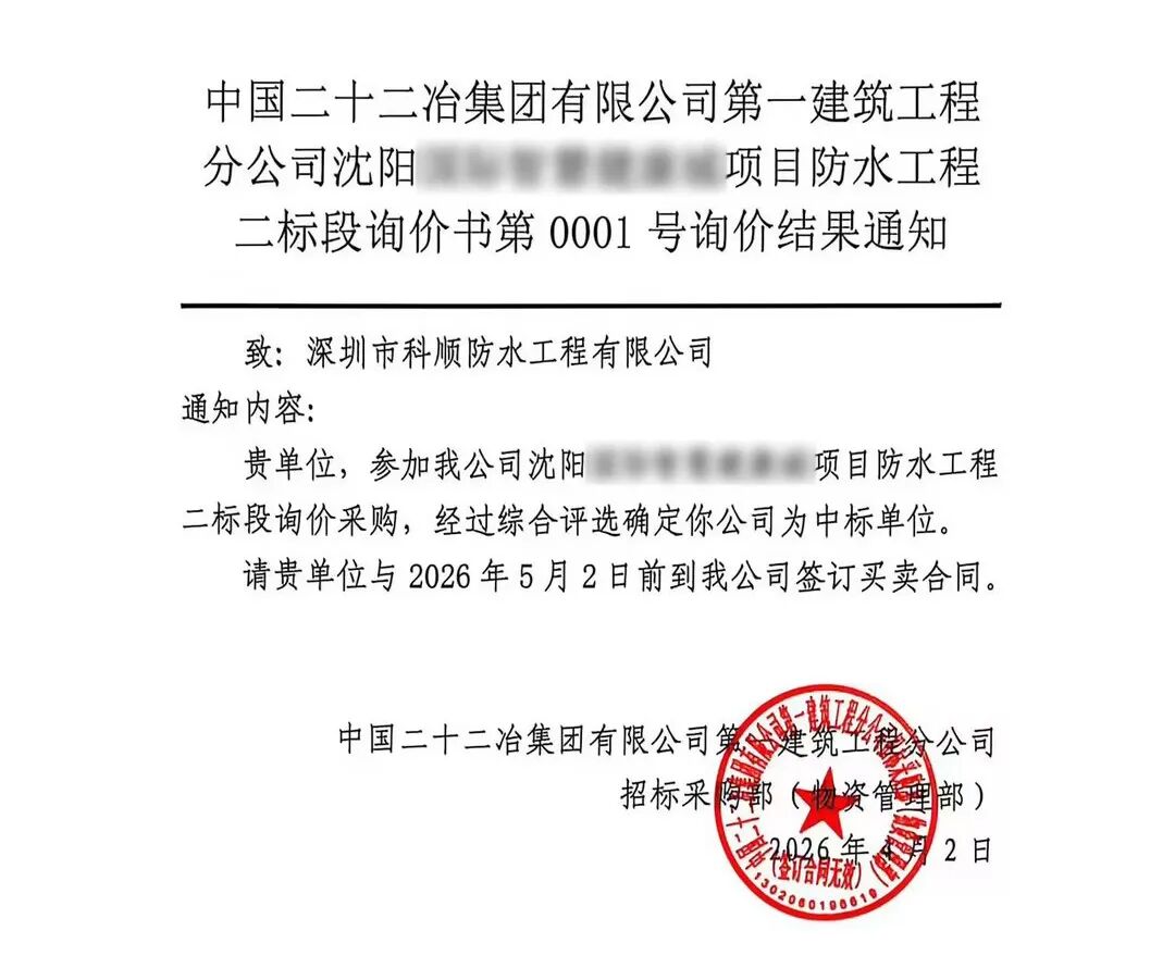 近日,科顺股份凭借优质防水解决方案与成熟双包履约能力,成功中标沈阳某重点民生健康综合体防水工程,中标金额高达1400万元,以专业匠心赋能区域民生健康事业高质量发展。