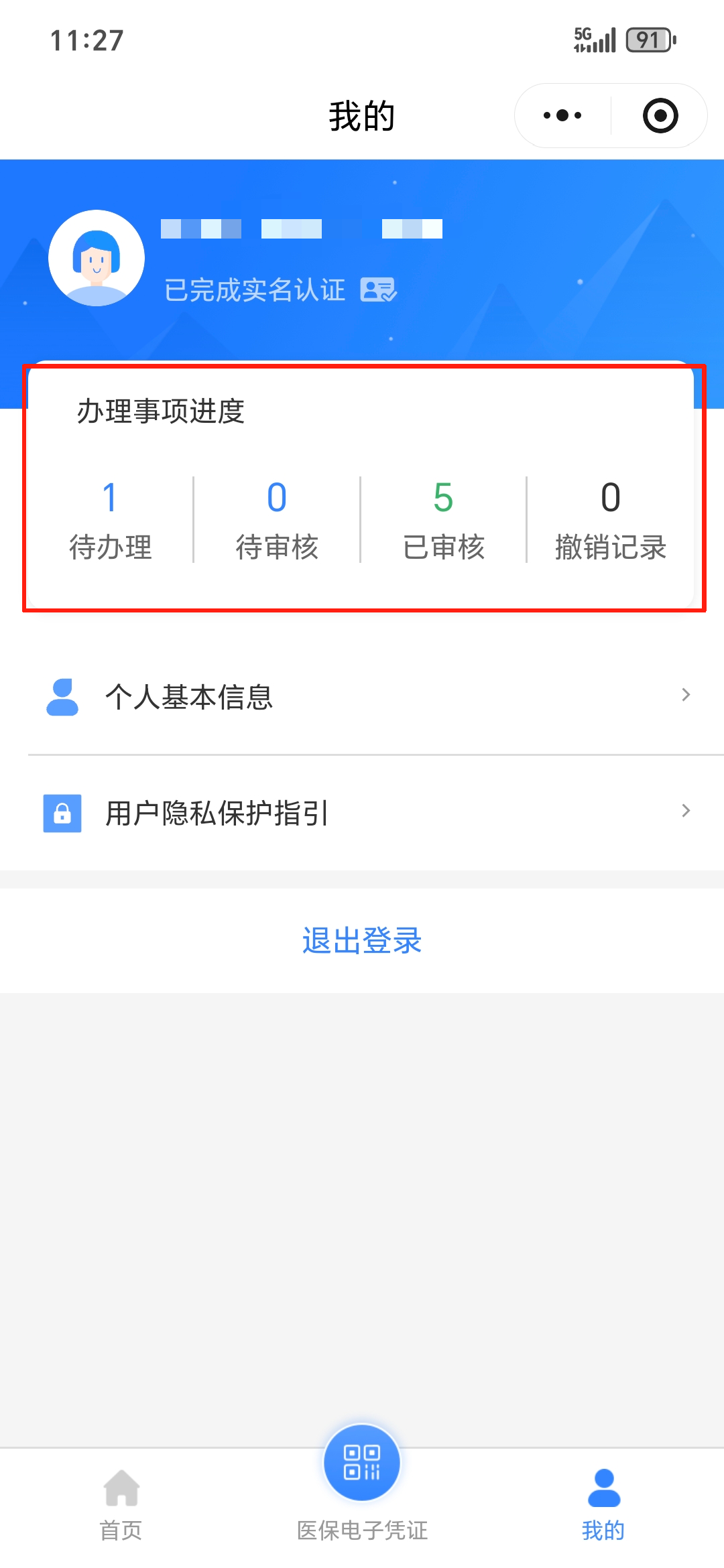 2、点击首页“我的”可看到“办理事项进度”。