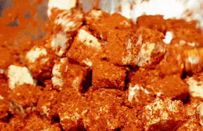 洁白的菌丝包裹着滑嫩的豆腐块,划块后快速拨入不锈钢盆中,拌入白酒、辣椒粉和花椒粉,一份集咸、鲜、香、辣、麻于一体的“霉豆腐”便做好了。
