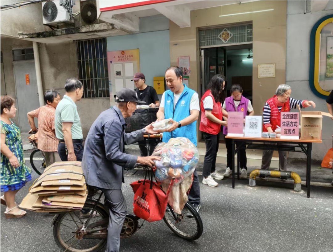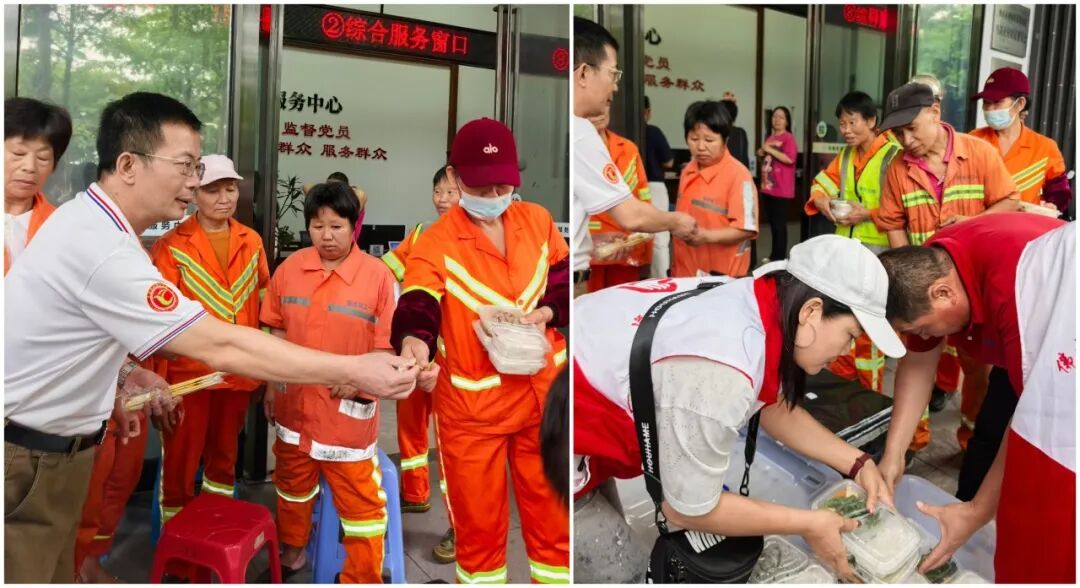 4月17日上午,清水桥社区、江湾社区、马岗社区联合粤潮爱心协会,共同开展“乐活社区三立方”春季健康讲座和健康膳食派发活动。尽管当天遭遇大雨,社区工作人员与志愿者克服天气影响,将600份爱心素食餐全部派发完毕,并为部分高龄、行动不便群众送餐上门。