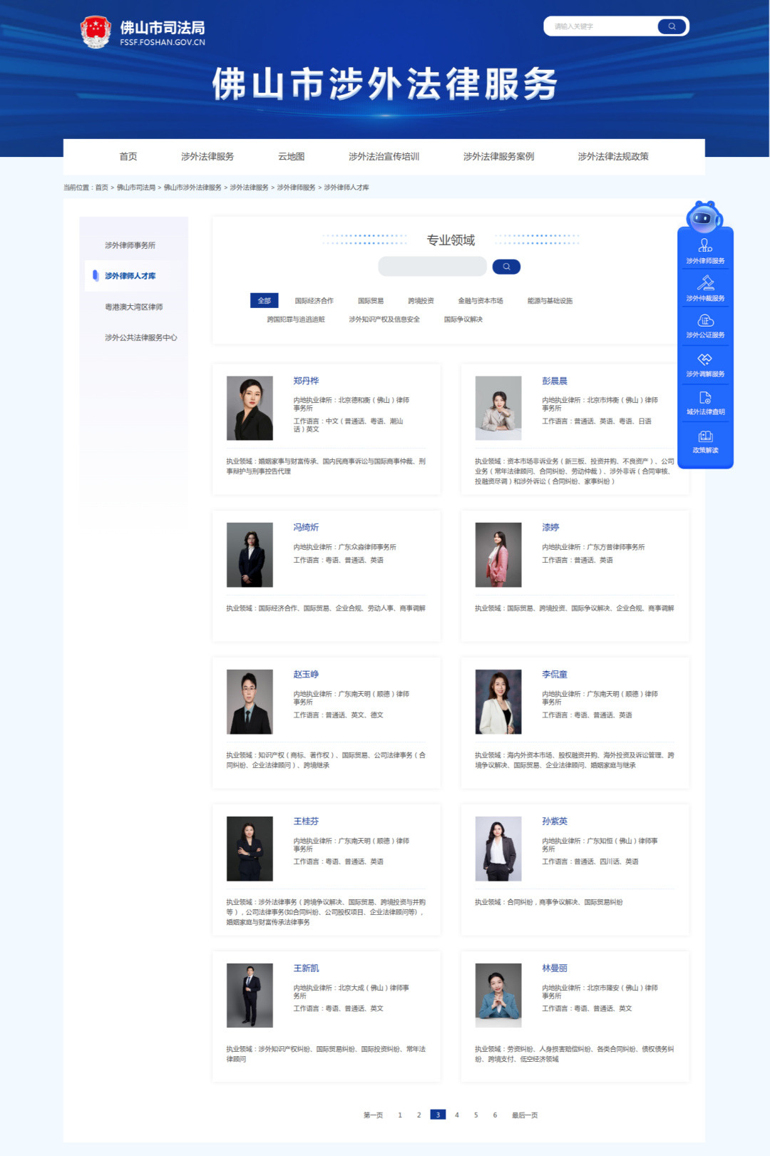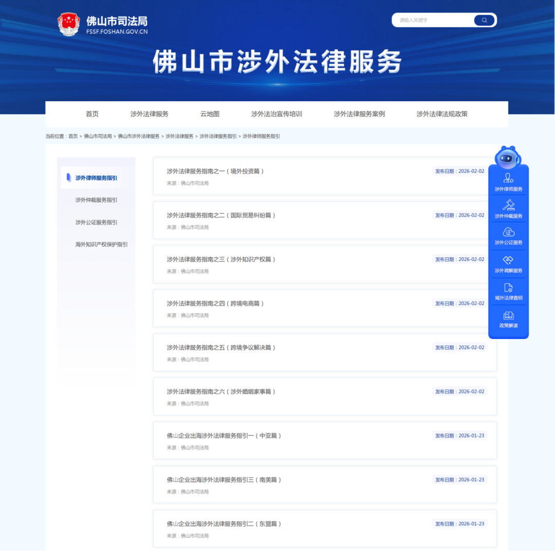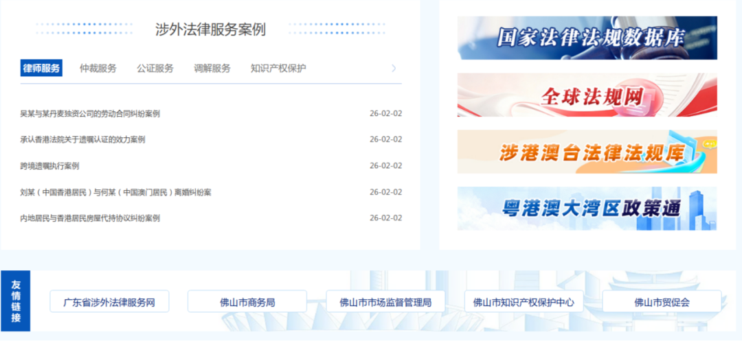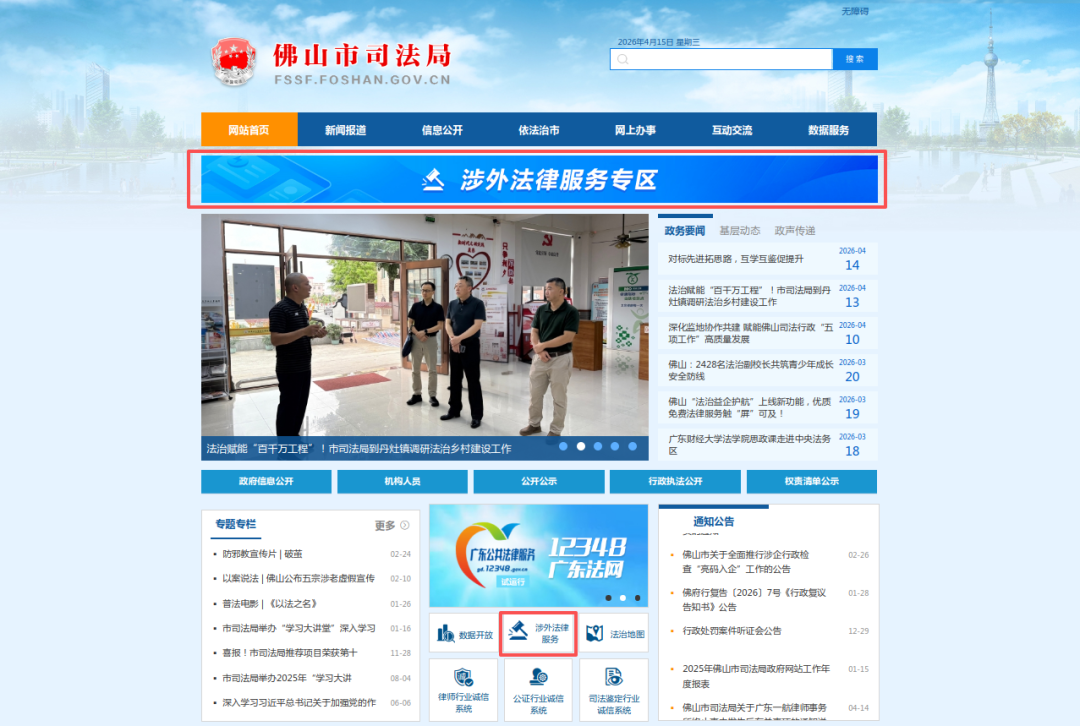 在佛山市司法局官网点击“涉外法律服务专区”可一键直达