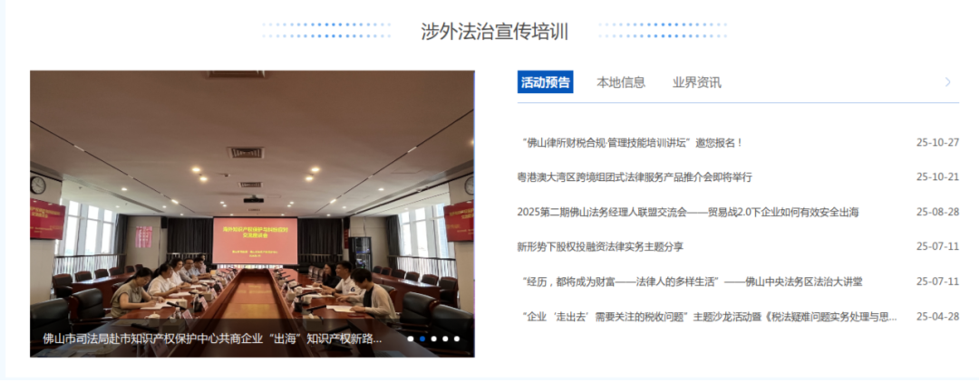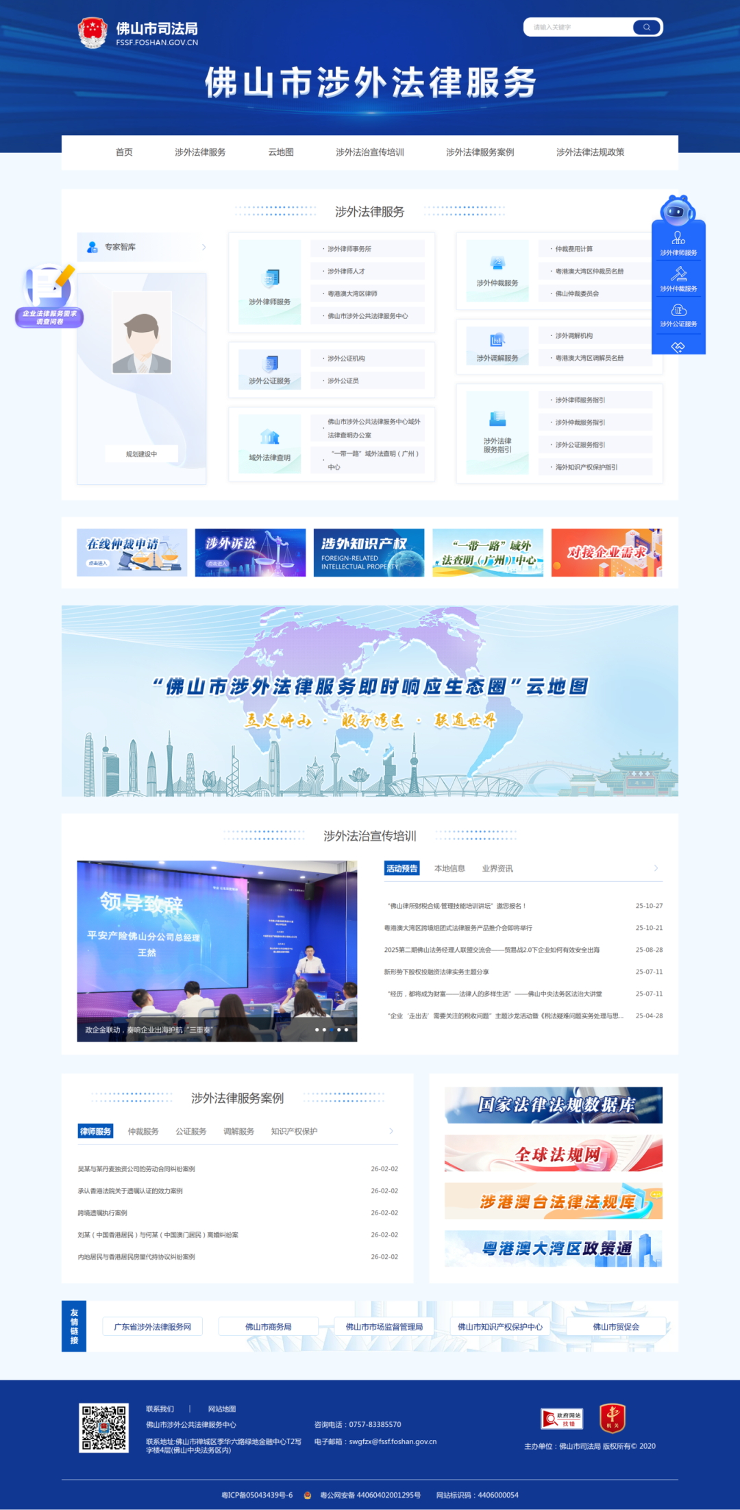 网站同步发布海外知识产权保护、涉外公证、涉外律师服务等专项指引,梳理国际贸易纠纷、涉外劳资纠纷、涉外知识产权等典型案例,以案释法为企业防范跨境法律风险提供实操参考,助力企业合规出海、稳健经营。下一步,平台将上线“佛山市涉外法律服务即时响应生态圈”云地图,打通线上服务对接通道,实现涉外法律服务资源地理化、可视化呈现。