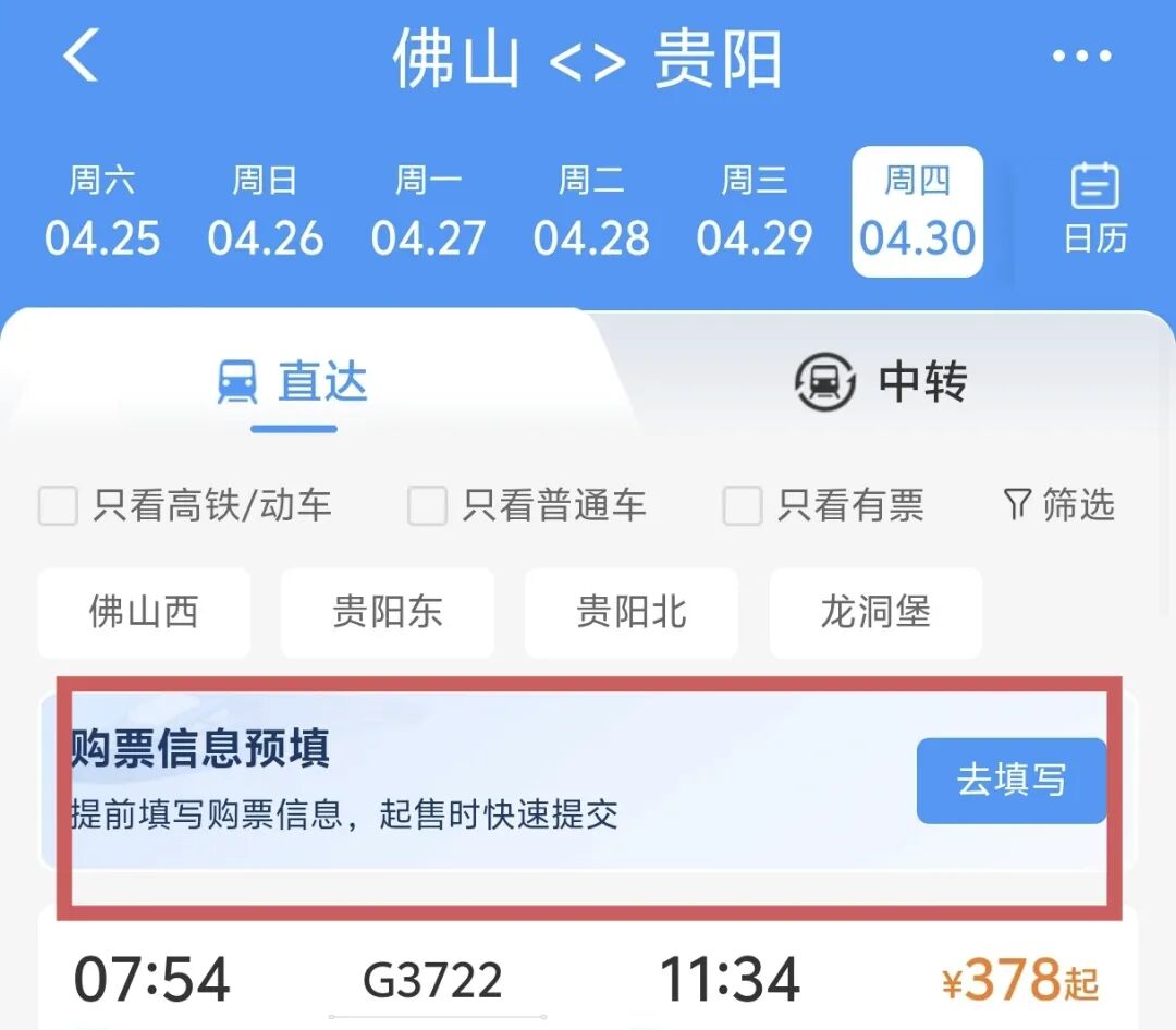 在车票起售当日,预先填写乘车人、车次、席别等信息,可快速提交订单并完成支付。