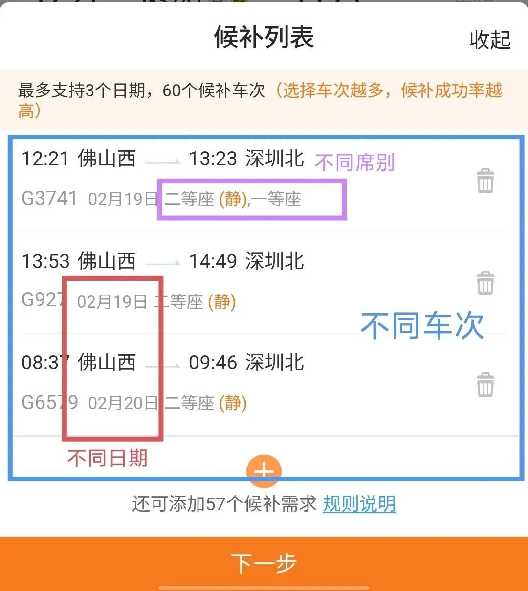 2. 每个候补订单最多可选择3个乘车日期,总计添加不超过60个车次;