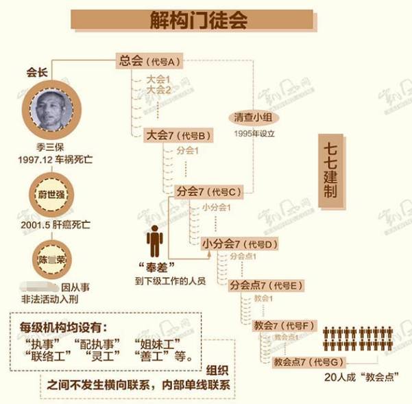 在“门徒会”内部,组织非常严密,有名为“七七建制”的组织体系,即组织分总会、大会、分会、小分会、点会、教会、聚会点七级,每级下设7个单位,季三保为总会的会长。参加该会的信徒之间不说真实姓名及地址,各级组织非常隐秘。