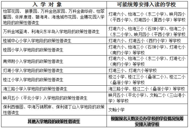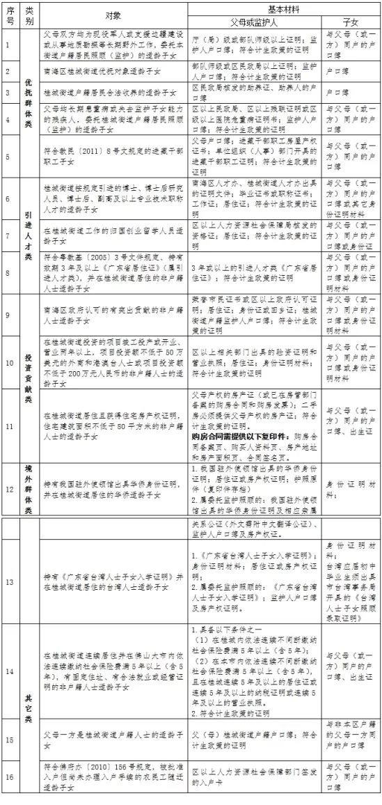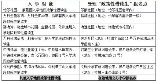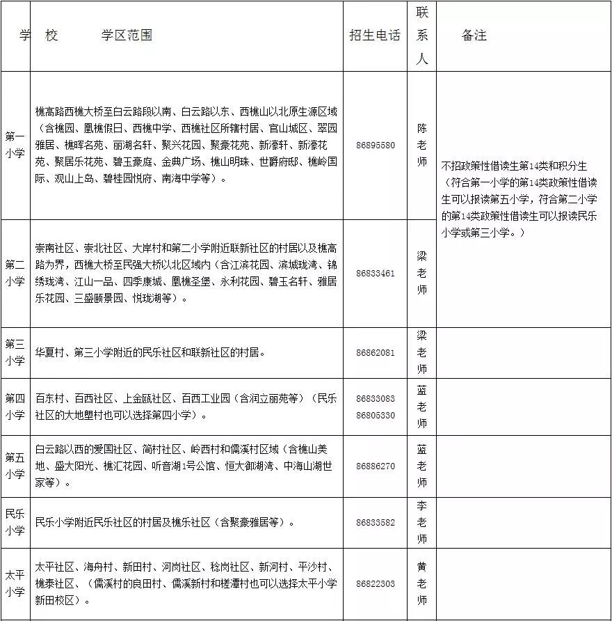 特别说明:各公办小学和指定社区,接受指定招生地段居住的符合佛山市政策性借读生条件的非户籍常住人口子女的借读申请。根据佛山市、南海区的招生政策,经审核符合条件的政策性借读生由桂城街道教育局统筹安排到公办学校就读。具体见下表。